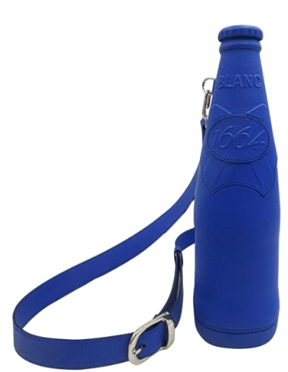 - Chất liệu túi bằng da bò thật. Có khung định hình để ra dáng chai bia 1664 Blanc, các chi tiết dập nổi và may ghép nối thủ công. Kích thước bằng 110% kích thước chai bia 1664 Blanc trên thực tế.
